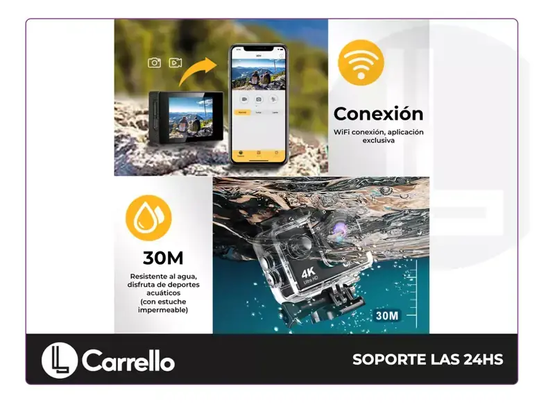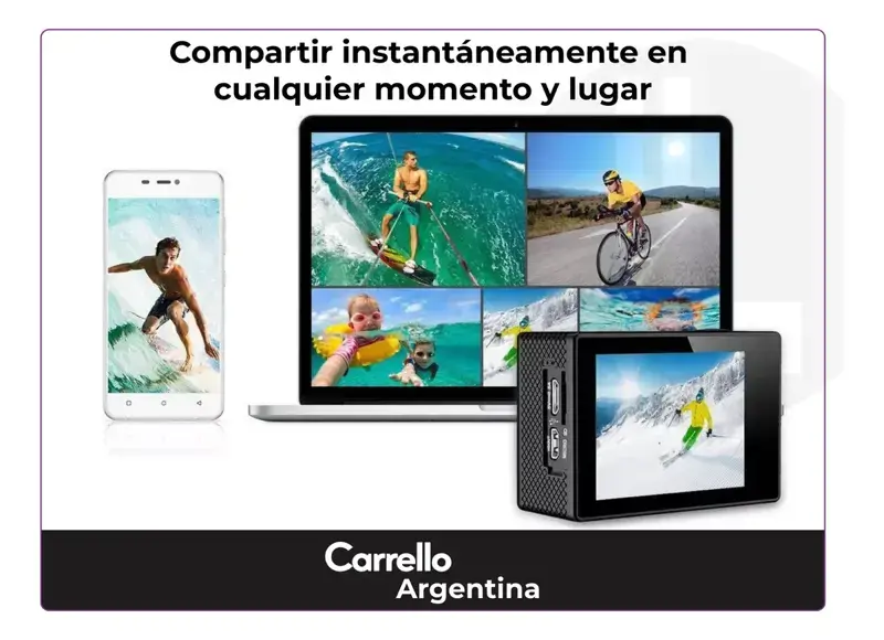 - Diseñada para la aventura: La cámara Carrello está lista para todo lo que le desees. Ya sea que estés escalando montañas, buceando en las profundidades o deslizándote por las laderas, el diseño duradero y la carcasa impermeable incluida (hasta 30 metros) mantendrán tu cámara protegida.