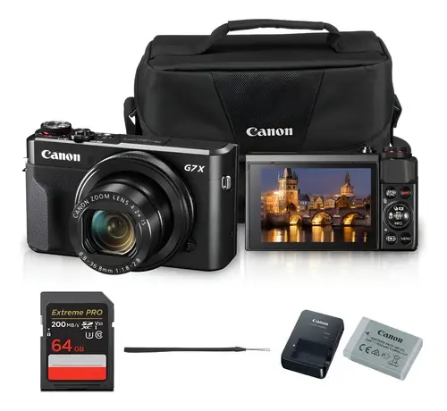 Elementos incluidos: Cámara digital Canon PowerShot G7 X Mark II (negra), batería Canon NB-13L, cargador Canon CB-2LH, correa de muñeca WS-DC12, bolsa de hombro, tarjeta de memoria de 64GB