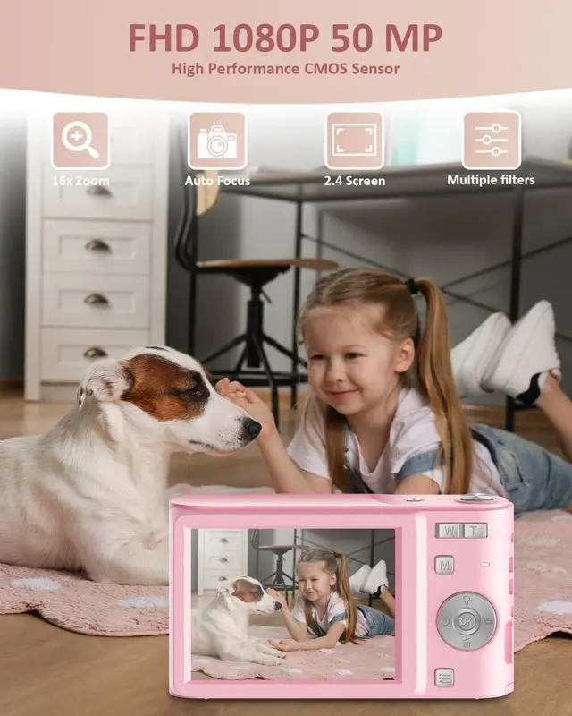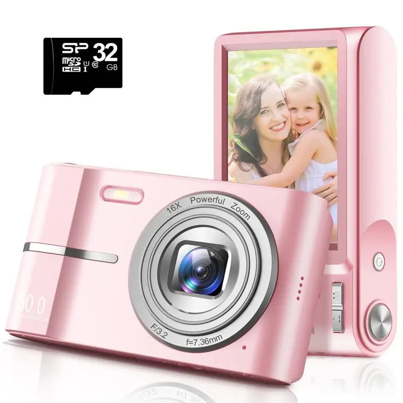 Cámara digital mejorada, cámara con enfoque automático de 50 MP, FHD 1080P con zoom de 16x y antivibración, cámara compacta para niños, estudiantes, adolescentes, niñas y niños, cámara para niños con tarjeta SD de 32 GB, 2 pilas, rosa