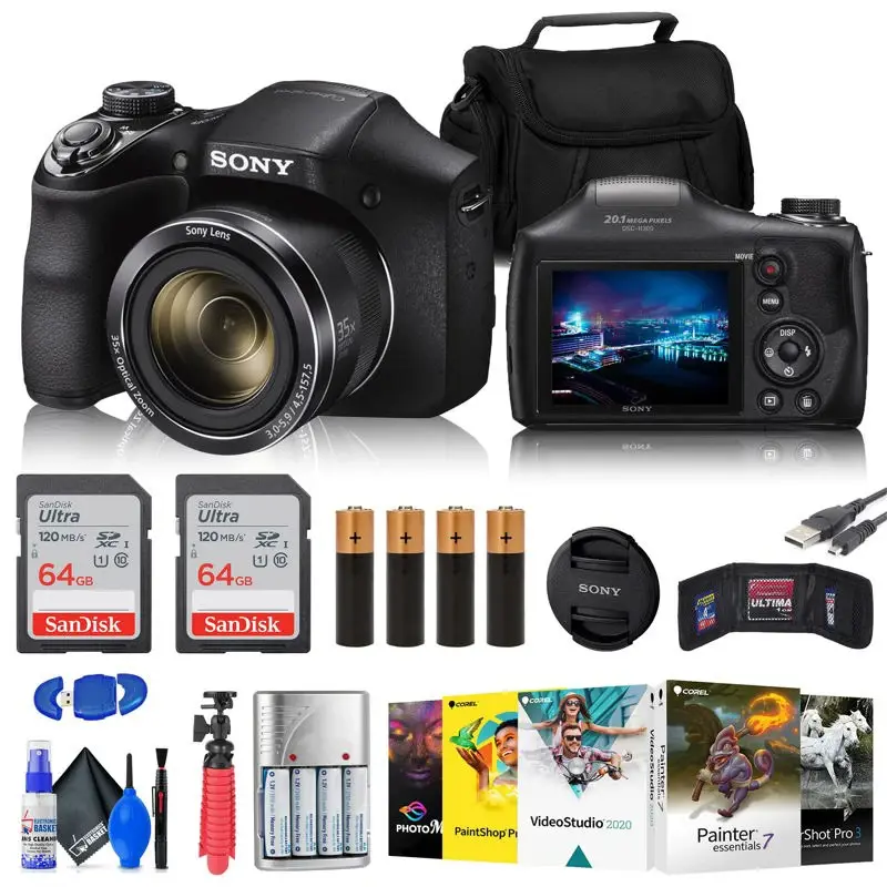 La cámara digital Sony Cyber-shot DSC-H300 negra es una cámara de apuntar y disparar que cuenta con un sensor de imagen CCD Super HAD de 20,1 MP y 1/2,3 pulgadas para producir imágenes fijas de alta resolución y vídeo HD de 720p. Este sensor se beneficia de la inclusión de un objetivo con zoom óptico de 35x de largo alcance, que proporciona un rango de longitud focal equivalente a 35 mm de 25 a 875 mm. Para fotografiar en condiciones de poca luz y cuando se trabaja con mayores aumentos de zoom, está disponible el estabilizador de imagen Optical SteadyShot para contrarrestar los efectos del movimiento de la cámara. Artículos incluidos por el fabricante: cámara digital Sony Cyber-shot DSC-H300 (negra), pilas alcalinas AA, correa de hombro, tapa de lente, cable multiUSB. El paquete incluye: 1 cámara digital Sony Cyber-shot DSC-H300 (negra), 2 tarjetas de memoria Sandisk Ultra de 64 GB, 1 lector de tarjetas de memoria, 1 software Corel Photo con PhotoMirage, AfterShot, Painter Essentials, Painter Essentials, Painter Pro y Video Studio, 1 x Deluxe Soft 1 trípode flexible de 12 pulgadas, 1 pila AA y cargador, 1 cartera para tarjetas de memoria, 1 kit de limpieza - El paquete incluye: 1 cámara digital Sony Cyber-shot DSC-H300 (negra), 2 tarjetas de memoria Sandisk Ultra de 64 GB, 1 lector de tarjetas de memoria, 1 software fotográfico Corel con PhotoMirage, AfterShot, Painter Essentials, Painter Essentials, Painter Pro y Video Studio, 1 funda blanda de lujo, 1 trípode flexible de 12 pulgadas, 1 pila y cargador AA, 1 funda de limpieza Kit - La cámara digital Sony Cyber-shot DSC-H300 es una cámara de apuntar y disparar con un sensor de imagen CCD Super HAD de 20,1 MP y 1/2,3 pulgadas para producir imágenes fijas de alta resolución y vídeo HD de 720p. Este sensor se beneficia de la inclusión de un zoom óptico de 35x de largo alcance, que proporciona un rango de longitud focal equivalente a 35 mm de 25 a 875 mm. Para fotografiar en condiciones de poca luz y cuando se trabaja con mayores aumentos de zoom, está disponible el estabilizador de imagen Optical SteadyShot para contrarrestar los efectos del movimiento de la cámara. - Para monitorizar y reproducir imágenes, así como para navegar por el sistema de menús, está disponible una pantalla LCD Clear Photo de 3 pulgadas y 461 000 puntos, que ofrece cinco niveles de brillo para facilitar la visualización en condiciones de mucha luz. También hay una gran cantidad de efectos de cámara para mejorar aún más el aspecto de las imágenes, como los efectos de imagen, los efectos de belleza, la detección de rostros, el modo panorámico de 360 grados y el modo iAuto. Además, el H300 funciona con 4 pilas AA. - Lente con zoom óptico de 5x y estabilización óptica de imagen SteadyShot. El objetivo con zoom óptico de 35x incorporado proporciona un rango de distancia focal equivalente a 35 mm de 25 a 875 mm, lo que ofrece perspectivas desde gran angular hasta superteleobjetivo para adaptarse a la mayoría de las situaciones de grabación. La función de largo alcance de este objetivo es la estabilización de imagen Optical SteadyShot integrada, que ayuda a reducir la apariencia de las vibraciones de la cámara. - Características principales: sensor CCD Super HAD de 20,1 MP y 1/2,3 pulgadas