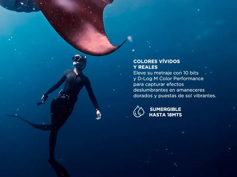 Colores vívidos y reales. Eleve su metraje con 10 bits y D-Log M Color Performance para capturar efectos deslumbrantes en amaneceres dorados y puestas de sol vibrantes. ¡Impresione a su audiencia con el brillo vívido de la cámara de acción!