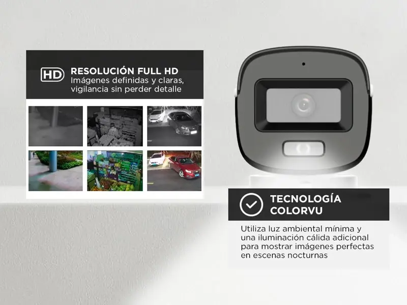 Tecnología ColorVu: Disfrutá de visión en color las 24 horas del día. Esta tecnología utiliza luz ambiental mínima y una iluminación cálida adicional para mostrar imágenes vibrantes, perfectas para escenas nocturnas.