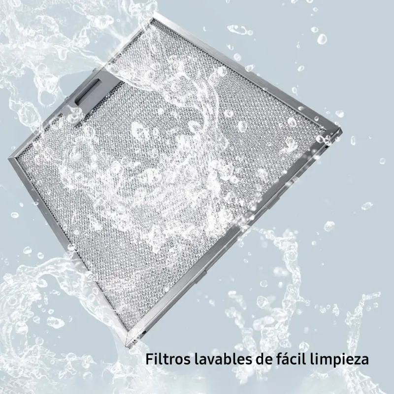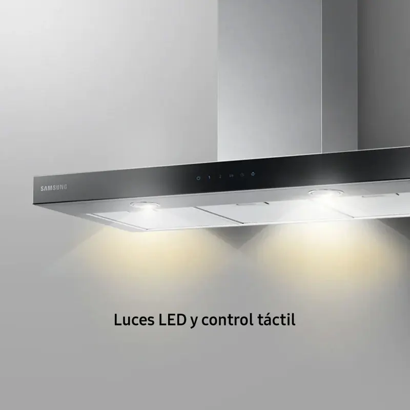 SE MANTIENE EXTRA LIMPIO Un filtro de aluminio duradero y fácil de mantener protege el ventilador de escape y prolonga la vida útil del motor. Captura el aceite y el polvo antes de obstruir el motor o dificultar el flujo de aire. Y solo necesita limpieza cada 3 a 4 semanas, lo cual es muy fácil ya que es lavable y lo bastante pequeño como para caber en un lavavajillas. BRILLA MÁS BRILLANTE La iluminación LED brillante facilita ver lo que cocinas con una iluminación uniforme en la superficie de toda la placa de cocción. Las luces LED consumen menos energía y duran mucho más. Así reduces tu consumo y ahorras en lámparas de repuesto. CONTROL CON UN TOQUE Disfruta de un control mucho más simple con control táctil integrado. Su panel LED brillante es claro y fácil de leer y tiene el mismo control intuitivo de una pantalla táctil de un teléfono inteligente, para que puedas ajustar rápidamente la configuración con un toque suave. Su estilo elegante y exclusivo también mejorará tu cocina. CARACTERISTICAS PRINCIPALES • Función Clean Air (cada 10 min) • Tipo de controles: Táctil • Cantidad de motores/ventiladores: 1 / 1 • Cantidad de velocidades de extracción: 4 (Booster 3+) • Extracción máxima (m3/h): 531 m3/h • Extracción Boost (m3/h): 668 m3/h • Sound Power: 70 dBA • Potencia de sonido (Boost): 75 dBA • Filtro de la campana: Filtro de aluminio, filtro de carbón • Tipo de extracción: Conducción del aire o recirculación MEDIDAS Ancho: 600 mm Altura (regulable): Mín. 619- Máx. 1147 mm Profundidad: 450 mm Campana de cocina Samsung de acero inoxidable con filtro lavable de aluminio, luces LED y control táctil de 60cm