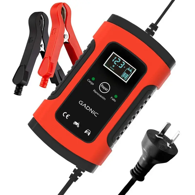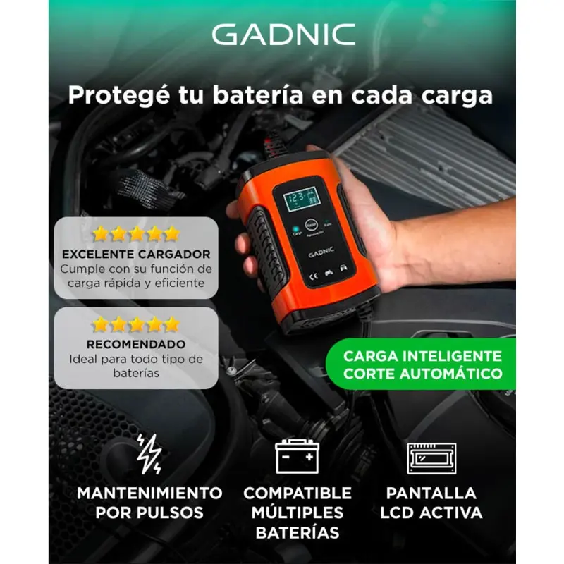 Gadnic presenta el nuevo cargador de batería para auto/moto: Capacidad de Carga: Salida de 12V 6A, adecuada para baterías de ácido-plomo de 12V. Potencia de Salida: 75W, permitiendo una carga rápida y eficiente. Entrada: AC 100-240V 50/60Hz, compatible con voltajes globales. Pantalla LCD: Muestra el estado de carga y la información relevante del proceso. Funciones de Seguridad: Protección contra sobrecargas, cortocircuitos y polaridad inversa. Tecnología de Reparación por Pulso: Ayuda a extender la vida útil de las baterías al reducir la sulfatación. Especificaciones Voltaje de entrada: 100-240V 50/60Hz Voltaje de salida: 12V Modo verano (? ?): 14,5 V Modo normal (8?-30?):14.8V Modo invierno (? ?): 15,5 V máx. (Medidas permitidas con tolerancia +/-0,4V) Corriente de carga masiva: 6.0A Temperatura de funcionamiento:
