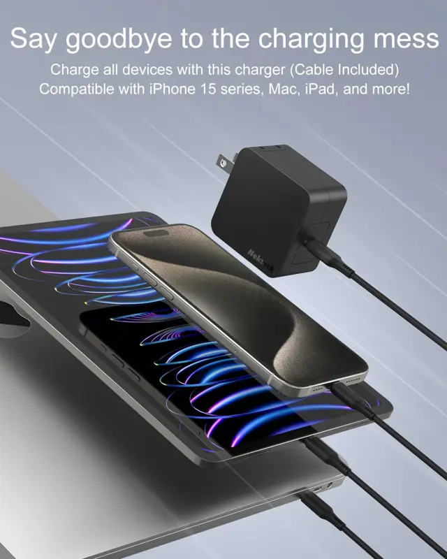 - Compacto y eficiente: la tecnología GaN no solo mejora la eficiencia de carga, sino que también reduce el tamaño del cargador en un 50% en comparación con los cargadores estándar de 60 W. Es una opción ideal para viajes internacionales.
