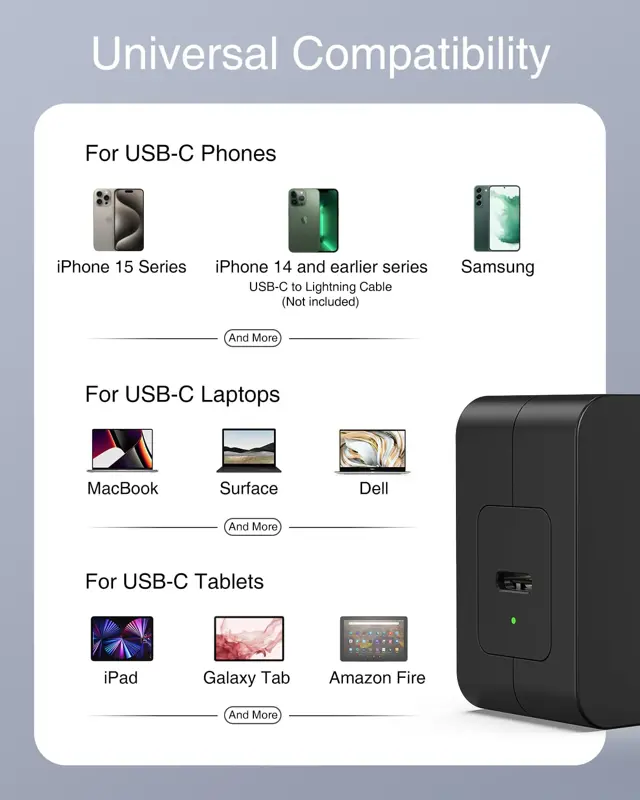 - Garantía de seguridad: Este cargador es USB-I(TID: 3489), FCC, certificado ETL. Utilizamos componentes de la más alta calidad y protecciones integradas para proteger tus dispositivos contra sobrecarga, sobretensión, sobrecorriente y sobrecalentamiento.