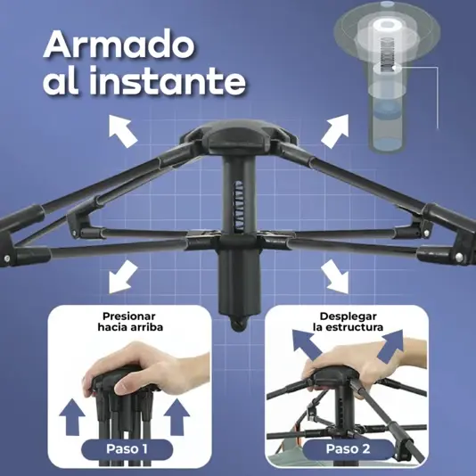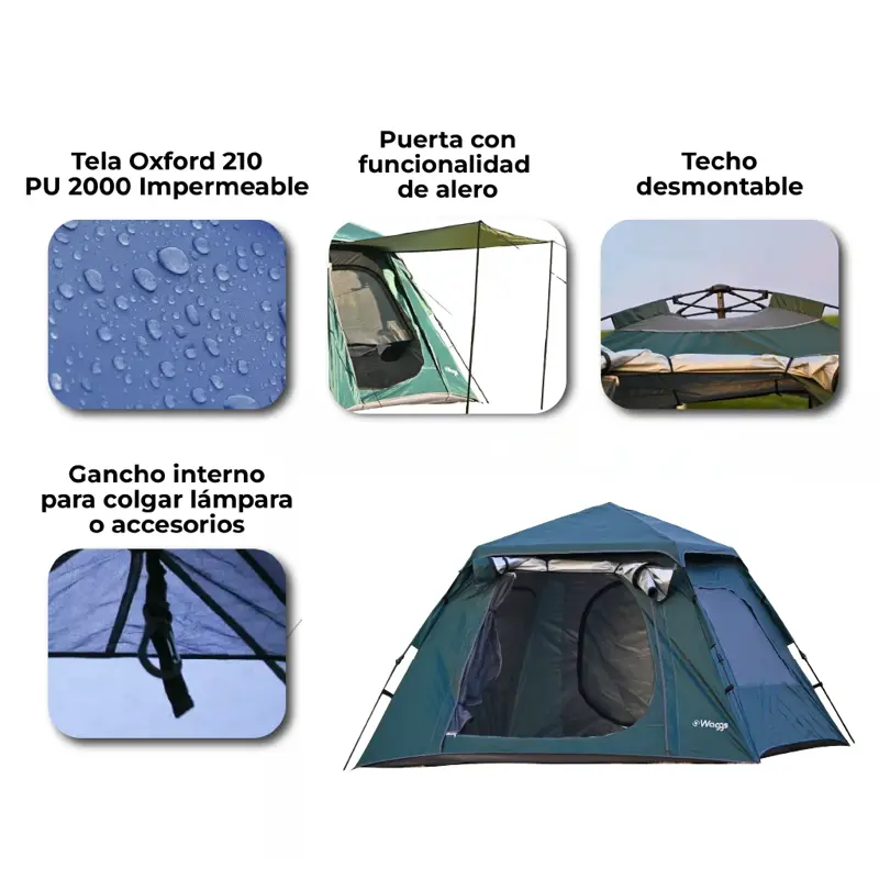 La WAGGS CARP07 está pensada para quienes buscan una carpa autoarmable amplia, práctica y resistente para disfrutar escapadas en familia o con amigos, combinando armado rápido, protección real y mayor comodidad. Su sistema HUB garantiza una estructura firme y estable en pocos segundos, mientras que el alero frontal integrado suma un espacio extra ideal para cocinar, organizar equipos o relajarse a la sombra. Fabricada en tela Oxford 210 con recubrimiento PU 2000 y filtro UV, ofrece protección confiable frente a lluvia y sol, adaptándose a sierras, lagos, bosque o playa. Cuenta con dos accesos completos con mosquitero Mesh B3, ventanas laterales con cierre interno y ventilación cruzada en todos los ingresos, asegurando circulación constante de aire y un interior fresco incluso en días de calor. Con capacidad para 4 a 6 personas, la CARP07 equilibra espacio, resistencia y funcionalidad, convirtiéndose en una aliada confiable para quienes priorizan practicidad, armado rápido y protección en cada aventura junto a WAGGS.