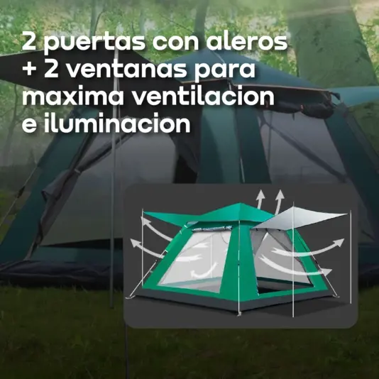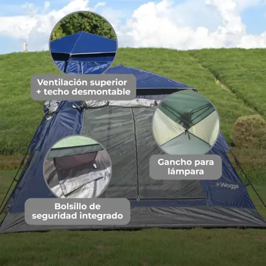 La Carpa Autoarmable WAGGS CARP09 está pensada para quienes buscan mayor espacio sin perder practicidad ni rapidez de armado. Su sistema autoarmable con varillas flexibles permite montarla en minutos, mientras que el techo desmontable se adapta al clima ofreciendo ventilación total o protección reforzada cuando es necesario. Con dimensiones amplias y capacidad para hasta 6 personas, brinda un interior cómodo y bien aprovechado, ideal para familias o grupos. Los aleros reforzados en ambas puertas aportan sombra, resguardo y mejor circulación de aire, y los mosquiteros Mesh B3 en accesos y ventanas mantienen el interior fresco y libre de insectos. Fabricada con tela Oxford 210, impermeabilidad PU3000 y costuras reforzadas, la CARP09 combina espacio, resistencia y diseño moderno para disfrutar escapadas más cómodas, ventiladas y simples desde el primer minuto junto a WAGGS.