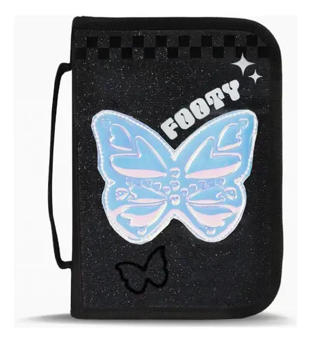 Cartuchera de 1 piso desplegable. Frente con glitter, pvc estampado y aplique de mariposa en holograma con relieveBolsillo interno transparente con cierre, interior estampado con logo FOOTY y elasticos para utiles.Tira cierres de rubber y manija lateral para llevar.MEDIDAS APROXIMADAS:Ancho: 15cmAlto: 22cmProfundidad :5cm
