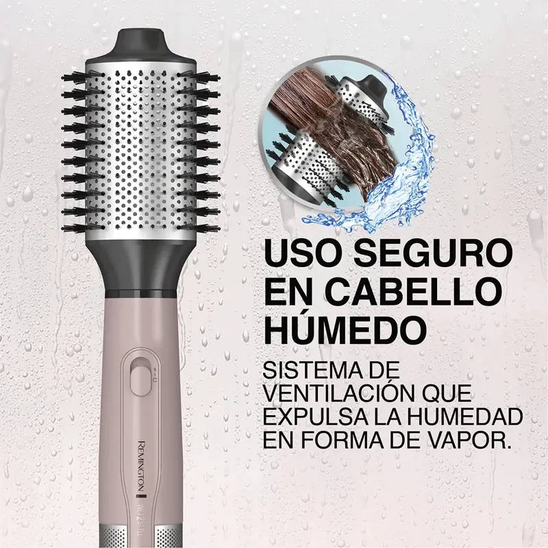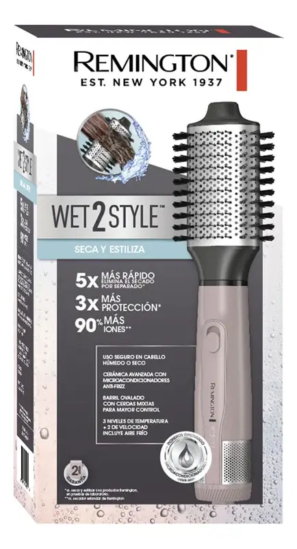 REMINGTON CEPILLO DE AIRE WET2STYLE CON ANTI FRIZZ (AS15A-220A) SKU: AS15A-220A Ahora hay una manera segura estilizar tu cabello húmedo con el cepillo de aire caliente Wet2Style. Este cepillo cuenta con un barril con ventilación, recubierto con cerámica y microacondicionadores antifrizz, que combina un poderoso flujo de aire con calor optimizado para secar y estilizar en un solo paso.