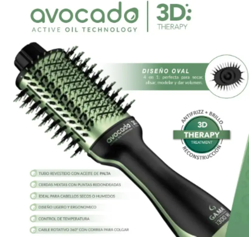 CEPILLO MODELADOR 3D MY AVOCADO POWER GAMA- Dise¦±o oval- 4 en 1 (perfecto para secar, alisar, modelar y dar volumen), avocado- 1300 w- 3 temperaturas y 3 velocidades punta fr¦_a- Bi Volt.- Aceite de avocado- Cerdas de cer¦¡mica con revestimiento de aceite de aguacate- Potencia 1 kW- Temperatura m¦¡xima del cepillo 200 ¦°C- Control de temperatura- Con funci¦nn anti-frizz- Modelo 3D MY Avocado- Origen: CHINA- Garant¦_a: 24 meses