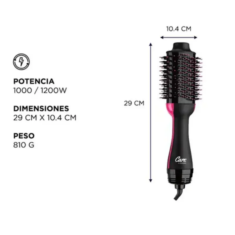 Cepillo Secador de Pelo Care By Gadnic S1200 Pro Voluminizador Calor ¡ GADNIC Care presenta su nuevalínea de productos de peluquería profesional ! Éste nuevo secador-cepillo de pelo presenta tecnología cerámica y de iones negativos que lo convierten en uno de los más versátiles y modernos del mercado. Ideal para uso profesional y domiciliario, incluye gancho de sujeción y cable 360 para mayor comodidad. Especificaciones Dimensiones: 29cm x 10.4cm Peso: 810 g Potencia: 1000-1200 W Voltaje: 220v Velocidades: 3 360 Grados: Sí