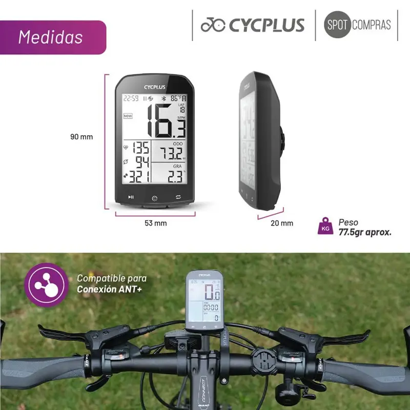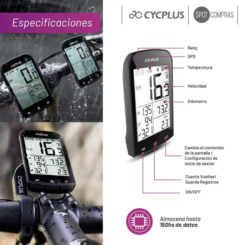Ciclocomputador GPS Cycplus M1 con pantalla de 2.9 pulgadas, resistente a la intemperie y con clasificación IPX6. Diseñado para medir tiempos, vueltas, velocidad máxima y promedio, altitud y odómetro entre otros parámetros durante tus recorridos en bicicleta.