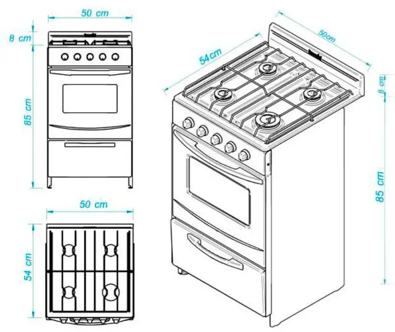 El horno y parrilla posee el sistema de fácil limpieza (easy to clean).El interior está totalmente enlozada en polvo electroestático y cuenta con puerta de horno con visor de bisagra desmontable y reja de plancha con apoya ollas. Las perillas son de plástico inyectado, la manija de plástico y el respaldo extraible.