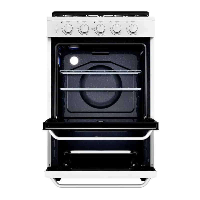 Se emitirá únicamente Factura B a consumidor final por las compras efectuadas en este canal de ventasCocina multigas de 56 cm. Color blanco. Puerta de horno con vidrio panorámico. Capacidad del horno: 74 litros. Luz en horno. Cajón parrilla con sistema deslizable y puerta rebatible. 2 parrillas superiores tipo solera. Válvula de seguridad. Botón de encendido eléctrico en horno y hornallas. Termocontrol en horno. Control frontal. Perillas plásticas. 2 parrillas cromadas deslizables en horno. Hornallas medianas y grandes con sensor de flama. Cubierta sellada de acero inoxidable. Sistema de limpieza Easy clean pro y Steam clean manual. Tecnología Perfect Cook. Incluye: KIT de conversión, Kit de instalación y antivuelco. Origen Argentina. Medidas sin empaque (cm): Alto total 94 – Alto hasta parrilla 86 x Ancho 56 x Profundidad 62Medidas con empaque (cm): Alto total 93,8 x Ancho 60 x Profundidad 69Peso sin empaque (kg): 35,8Peso con empaque (kg): 37,2