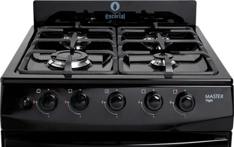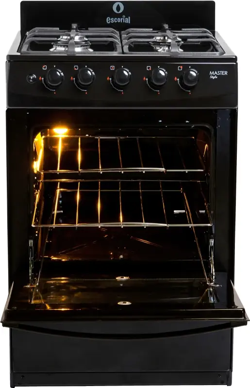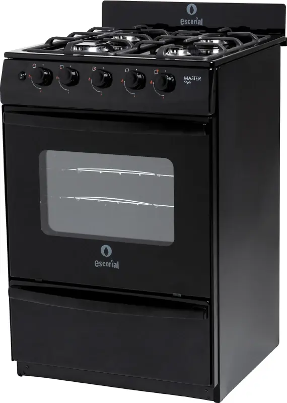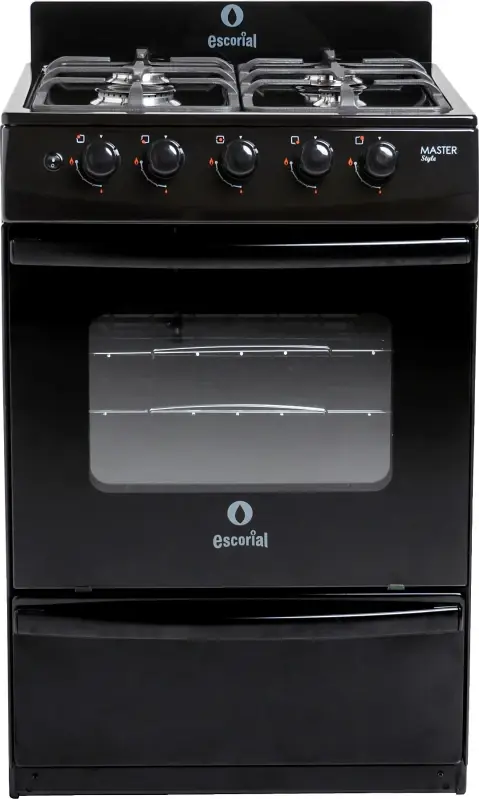 Características.Con 4 hornalla, 2 medianas, 1 chico y 1 grande son de aluminio pulidos con tapa de acero esmaltada que lo hace resistente a las sustancias líquidas que puedan derramarse al momento de cocinar, el horno cuenta con tapa de vidrio y reja de hornoesmaltada y una válvula de seguridad que permite su uso de forma segura.Además, las superficies exteriores e interior del horno totalmente enlozados en polvo electrostático de fácil limpieza.Un producto completo.La cocina MASTER STYLE de Escorial cuenta con 4 hornallas, de encendido eléctrico a mano, es un producto que utiliza gas envasado de clasificación doméstico, es ideal para realizar varias recetas a la vez usando todos los componentes, tanto la hornalla y el horno.Diseño.La estructura de acero inoxidable que asegura su duración por un tiempo prologando y aún más si se aplica los cuidados necesarios en cuanto a higiene. El tamaño de 56 cm otorga un espacio amplio para realizar todo lo que necesitas.Con cajón parrilla y puerta rebatible.