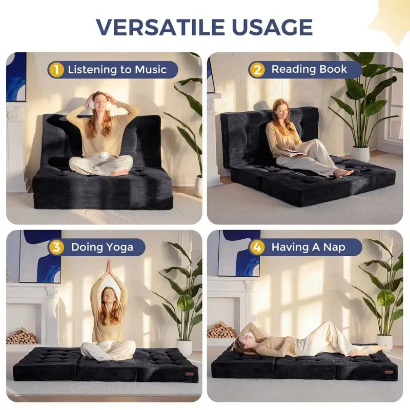 - Colchón de tres pliegues: nuestro colchón plegable de triple pliegue se puede desplegar fácilmente en un cojín de asiento espacioso y cómodo. Cuando está plegado, es compacto y ocupa poco espacio. Ya sea para descansar en interiores, picnics, yoga o uso diario en el hogar, es fácil de usar y te permite disfrutar de la comodidad en cualquier momento y en cualquier lugar
