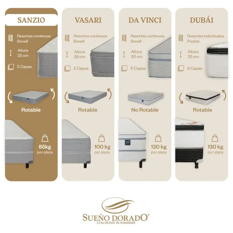- Rotar el producto de pies a cabeza cada 15 días, y de lado a lado (boca arriba a boca abajo) cada 30 días. Esto asegurará la vida útil declarada y permitirá un desgaste parejo de los materiales.