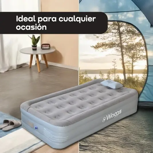 Con el colchón inflable de 1 plaza WAGGS COLI04 disfrutá un descanso portátil de nivel superior gracias a su inflado eléctrico USB, su estructura interna Fiber-Tech y su altura tipo sommier que brinda mayor confort y mejor postura. Diseñado para quienes buscan practicidad, armado rápido y comodidad real, se infla automáticamente en solo 2 a 4 minutos sin esfuerzo, ofreciendo una superficie firme, estable y uniforme que evita hundimientos y soporta hasta 273 kg. Su acabado de PVC felpado aporta suavidad y evita el deslizamiento de las sábanas, mientras que su formato liviano y portátil lo hace ideal para camping, viajes, mudanzas, visitas o uso indoor y outdoor. Incluye almohada inflable, bolso de transporte, bomba eléctrica USB y accesorios, convirtiéndose en una solución completa, moderna y confiable para descansar donde lo necesites, con la calidad y tecnología que distingue a WAGGS.