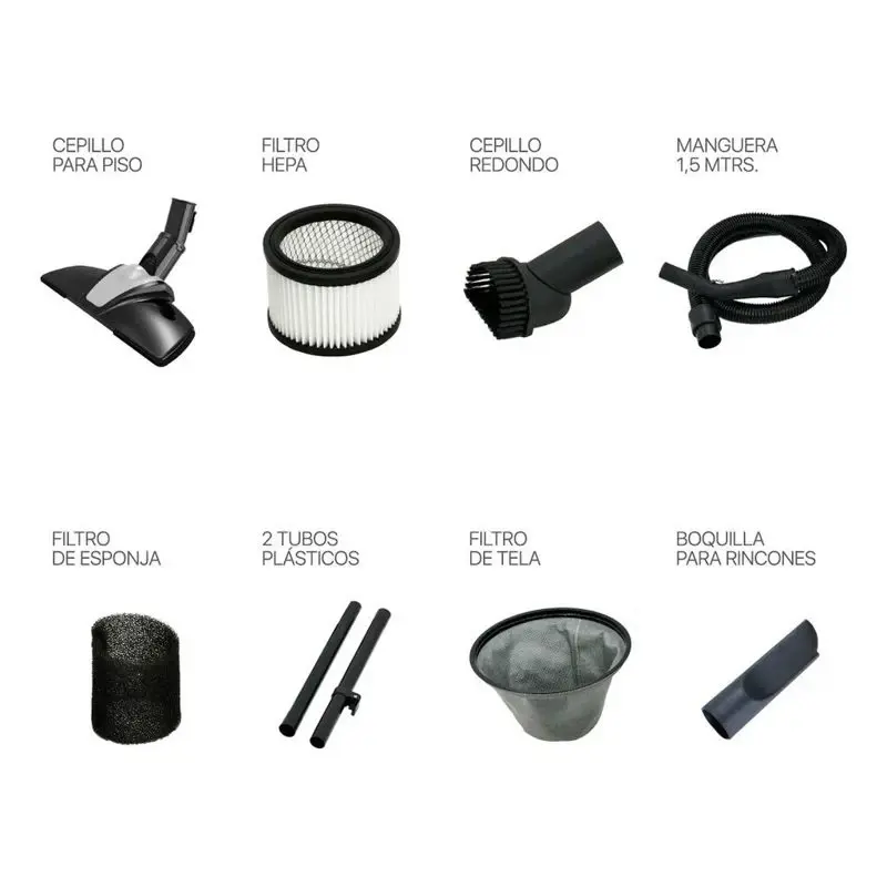 Accesorios incluidos: Cepillo para piso, cepillo para tapizados, boquilla para rincones, 2 tubos plásticos de extensión