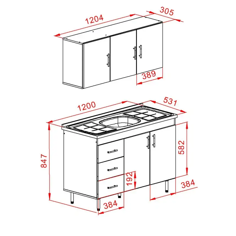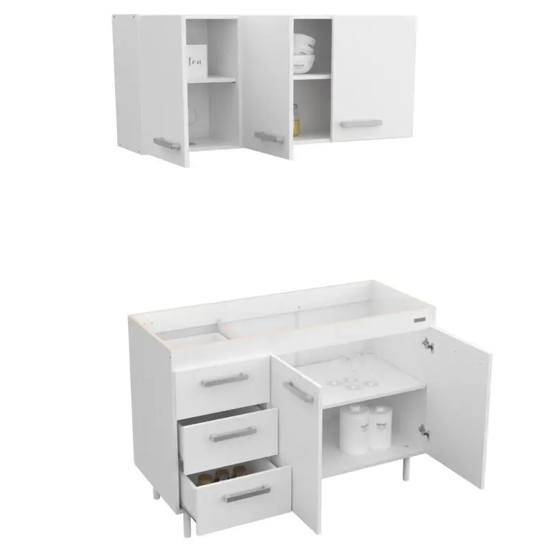 ESPECIFICACIONES:* Colores: Blanco- Blanco con frente Chocolate* Medidas: Alacena 120x31x50 cm. / Bajo mesada 120x50x82 cm.* Fabricado en Melamina sobre MDP 15 mm.* Alacena con 3 puertas y 1 estante.* Bajo mesada con 2 puertas y 3 cajones con correderas metálicas.* Costado y contrafrente de cajón de melamina blanca 15 mm. Fondo blanco. * Manijas plásticas color gris que pueden colocarse de manera HORIZONTAL o VERTICAL.* NO INCLUYE BACHA.PACKAGING: 2 BULTOSMedidas bulto 1: 121x58x7 cm.- Peso: 24 kg.Medidas bulto 2: 137x62x12 cm.- Peso: 36 kg.