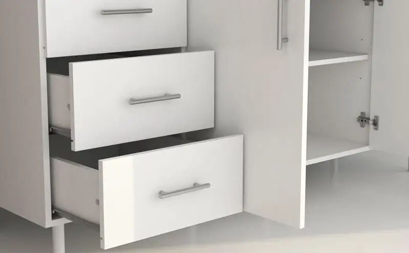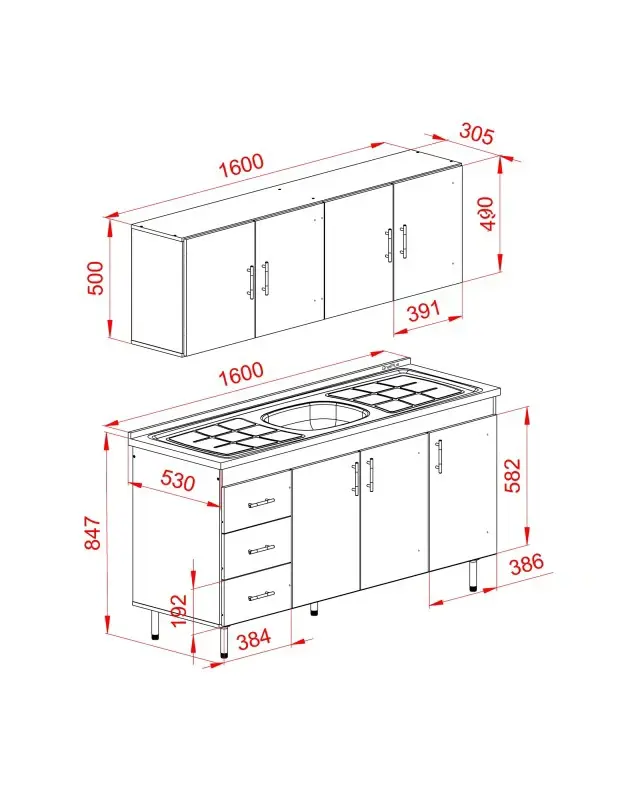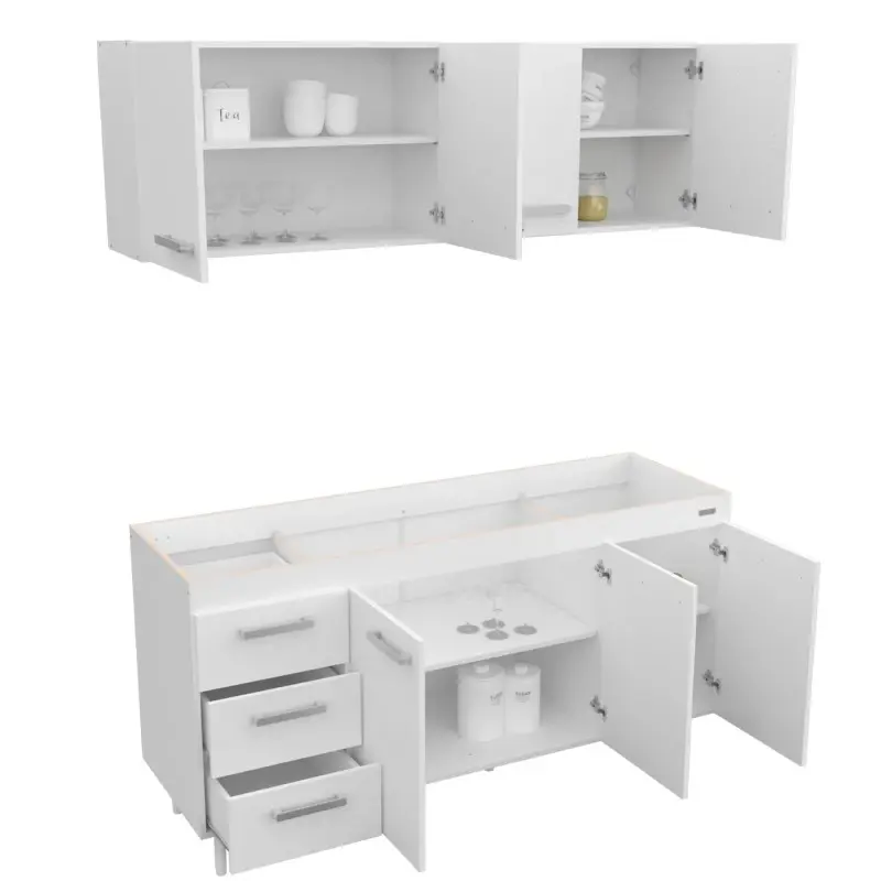 ESPECIFICACIONES:* Colores: Blanco-* Medidas: Alacena 160x31x50 cm. / Bajo Mesada 160x50x82 cm.* Fabricado en melamina 15 mm. * Cajones con correderas metálicas.* Puertas con bisagras a resorte y alacenas con estantes. Fondo blanco. * La cajonera se puede armar a la IZQUIERDA o a la DERECHA.* Manijas plásticas color gris que pueden colocarse de manera HORIZONTAL o VERTICAL.* NO INCLUYE BACHA.PACKAGING: 2 BULTOSMedidas bulto 1: 169x61x8 cm.- Peso: 29 kg.Medidas bulto 2: 162x62x13 cm.- Peso: 45 kg.