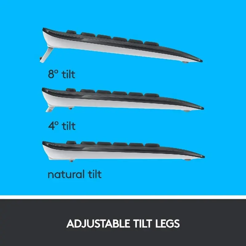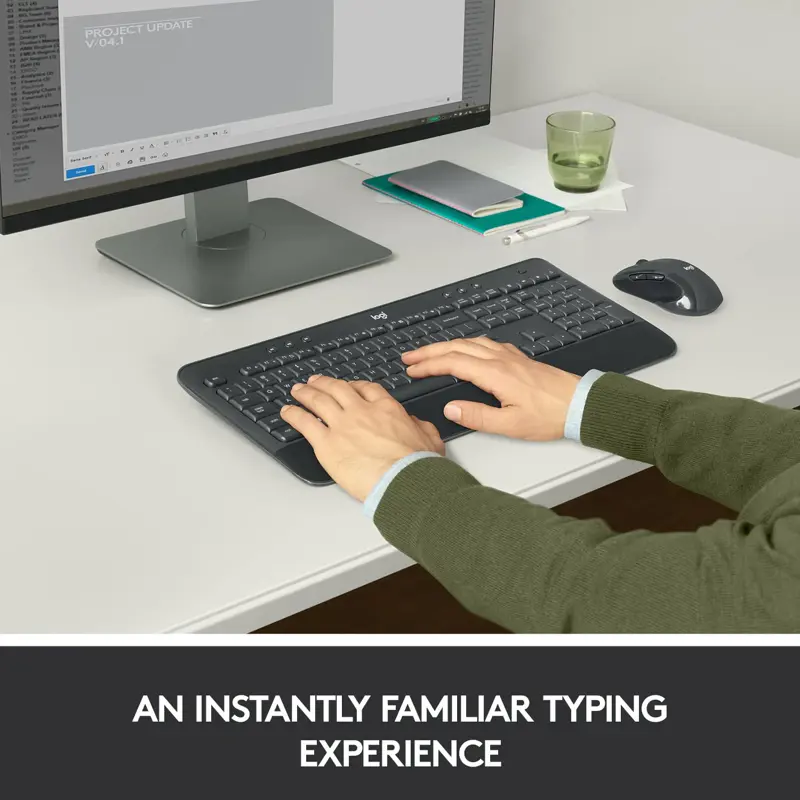 El combo inalámbrico Logitech MK545 Advanced de teclado y ratón ofrece una experiencia de escritura y navegación cómoda y fluida para tareas informáticas diarias. El teclado de tamaño completo cuenta con un reposamuñecas texturizado y patas ajustables para inclinación, permitiendo mantener una postura ergonómica durante largos períodos. Los controles multimedia y los atajos de teclas de función brindan acceso rápido a funciones esenciales, mejorando la productividad.