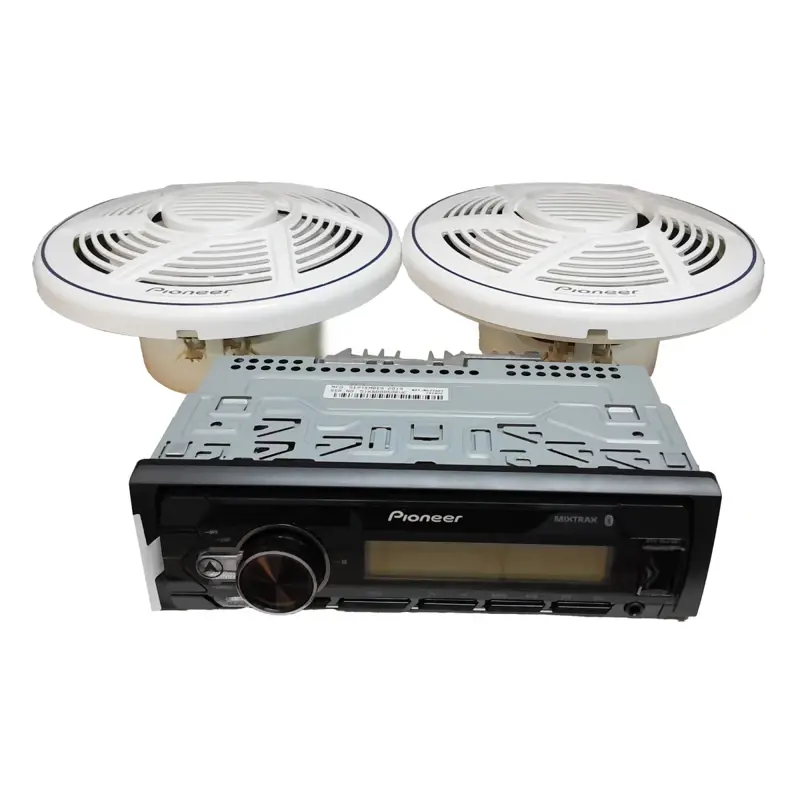 El combo marino Pioneer MXT-MS316BT combina un potente estéreo y parlantes diseñados especialmente para su uso en entornos marinos. El estéreo Pioneer MVH-MS310BT cuenta con conectividad Bluetooth para llamadas manos libres y transmisión de audio, control directo para iPhone y algunos teléfonos Android, así como Pioneer Smart Sync para una experiencia de usuario intuitiva. Con salidas de preamplificador de 4 canales, reproducción de una amplia variedad de formatos de audio y tecnología de DJ virtual MIXTRAX, este estéreo ofrece un rendimiento de audio excepcional. Además, tiene una carga rápida por USB para dispositivos Android y la capacidad de conectar dos teléfonos simultáneamente. Los parlantes marinos Pioneer TS-MR1600 proporcionan un sonido nítido y potente. Con un tamaño de 16.5 cm y 2 vías, ofrecen una potencia RMS de 25W y una potencia máxima de 100W. Su construcción resistente al agua y su material compuesto IMPP blanco aseguran durabilidad y calidad de sonido incluso en condiciones marinas adversas. Con una sensibilidad de 90 dB y una respuesta de frecuencia de 30 Hz a 20 kHz, estos altavoces ofrecen un rendimiento excepcional para disfrutar de tu música mientras navegas.