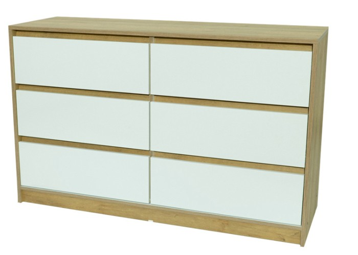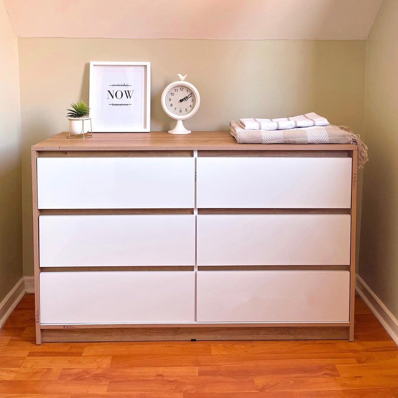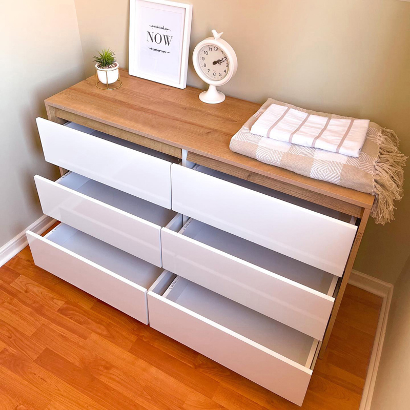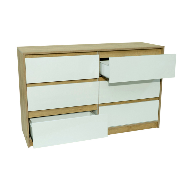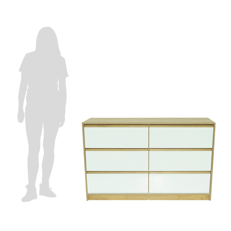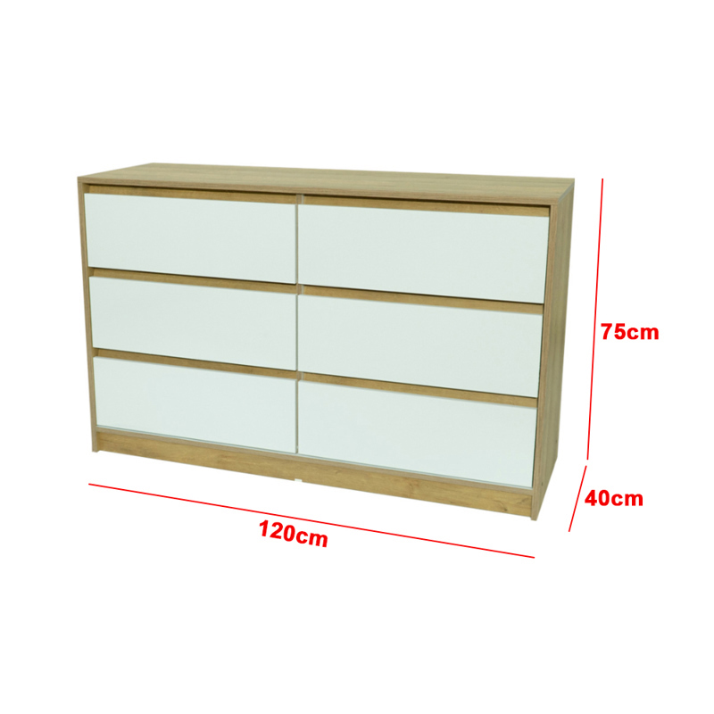 Esta cómoda de 6 cajones combina frentes blancos con fajas de madera natural, logrando una estética limpia y elegante. Ideal para dormitorios, vestidores o cualquier espacio que necesite un plus de almacenamiento sin perder diseño.Cuenta con 6 cajones amplios con frente blanco y detalles tipo faja, brindando lugar suficiente para ropa, textiles o accesorios personales, cSe entrega desarmada con manual de armado fácil de seguirMedidas:Ancho:120 cmProfundidad: 40 cmAlto: 75 cmMarca: Muebles Gacela
