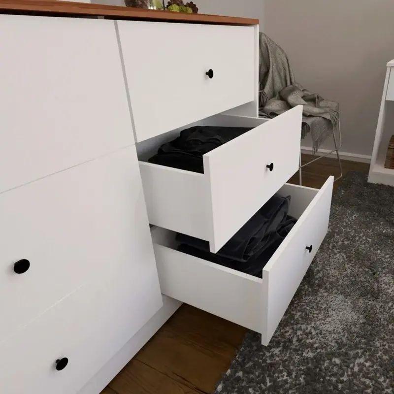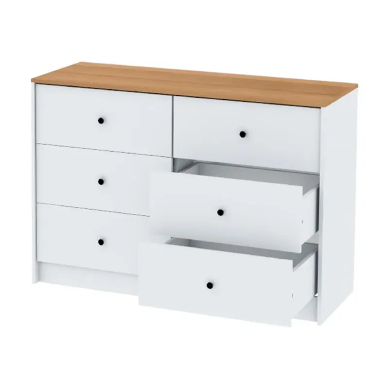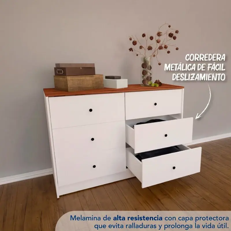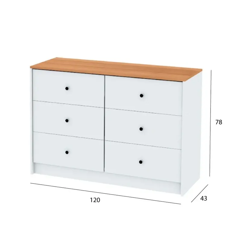 CENTRO ESTANT COMODA ALICANTE 6 CAJONES BLANCA PARAISO SKU: CM122BLP Descripción Cómoda Cajonera Dormitorio 6 Cajones Centro Estant Blanco/Paraíso Este mueble de líneas clásicas y sencillas, con seis cajones, es perfecto para cualquier tipo de habitación. Te permite organizar tu ropa, sábanas, toallas, documentos importantes y todo lo que necesites. Su material de melamina ofrece una gran protección contra el deterioro, evita ralladuras y la abrasión, prolongando la vida útil de nuestros productos. El producto se entrega desarmado en caja de cartón corrugado de alta resistencia, cubierta con un film termo contraíble que protege en su traslado. En su interior encontrarás las piezas y herrajes necesarios para armar el mueble. Características: Material: melamina Alto del mueble:78 cm Ancho del mueble: 120 cm Profundidad del mueble: 43 cm Peso del mueble: 49 kg Cajones: 6 Correderas: metálica Línea: libe Ambiente: dormitorio Peso embalaje: 50 kg Dimensiones embalaje: 123 x 15 x 43,5 cm Origen: Argentina Colores: Blanco/Paraíso 24 MESES DE GARANTIA CON LA MARCA