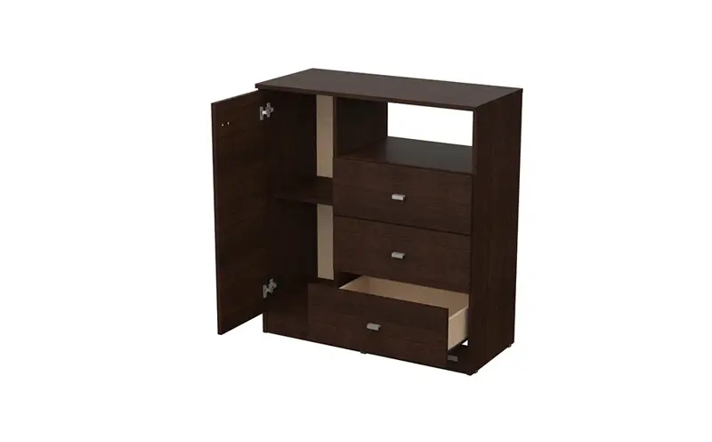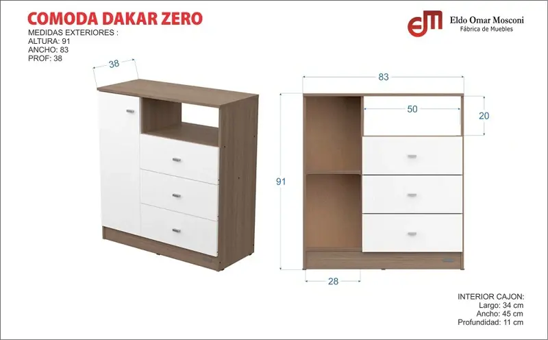 CÓMODA DAKAR ZEROESPECIFICACIONES:Colores: Blanco- Wengue- Tabaco- Venezia- Carvalho Mezzo frente BlancoMedidas: 91x38x83 cm.Material: melamina sobre MDP 15 mm. 1 puerta (tipo de apertura: batiente). 3 cajones con correderas metálicas. Interior y laterales no revestidos.Tiradores plásticos color gris.Marca: MosconiMEDIDAS INTERIORES DEL CAJÓN: 45x34x11 cm.PESO MÁXIMO SOPORTADO POR CAJÓN: 10 kg.CARGA MÁXIMA ADMISIBLE TOTAL: 80 kg.PACKAGING: 1 BULTOMedidas: 91x41x17 cm.- Peso: 31 kg.