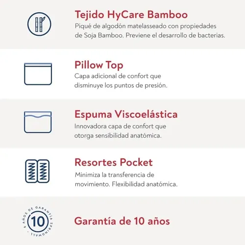 • Estructura de Resortes Pocket embolsados individualmente, minimiza la transferencia de movimiento garantizando un descanso ininterrumpido.