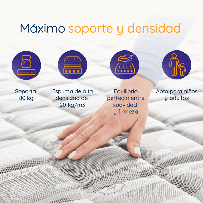 El colchón está diseñado con espuma de alta densidad, brindando un soporte firme y parejo, ideal para un descanso reparador todos los días. El sommier potencia su durabilidad y estabilidad, evitando deformaciones y asegurando un rendimiento superior a lo largo del tiempo.