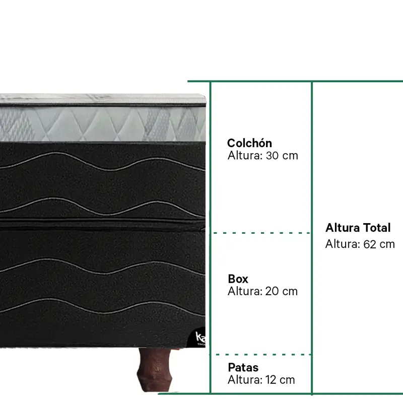 El colchón tiene 30 cm de alto, el box 20 cm y las patas 12 cm, resultando en un conjunto de 62 cm de altura total