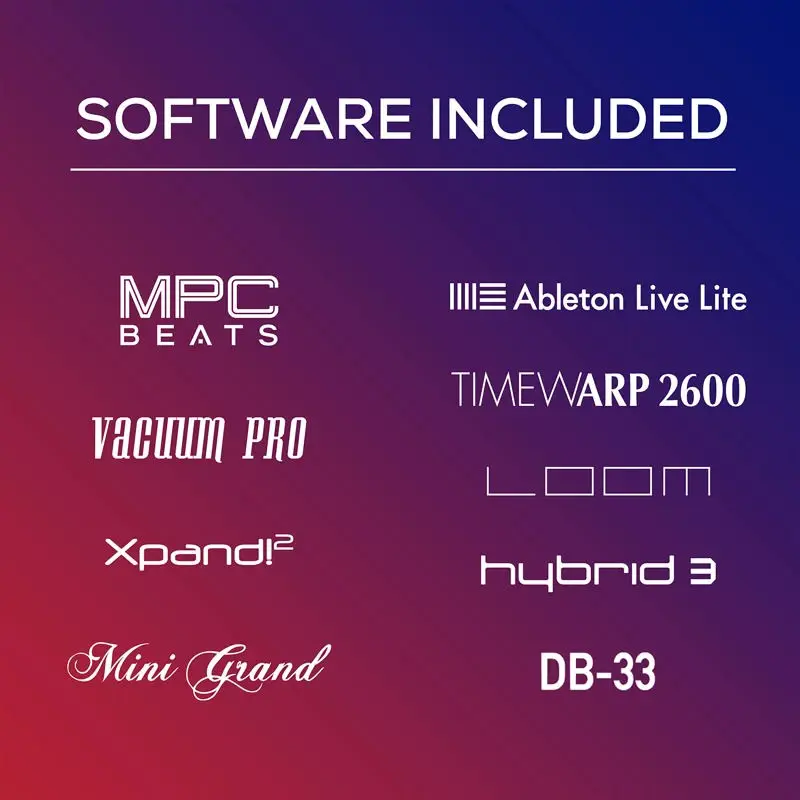 - Incluye un paquete de software de produccion de primera clase: MPC Beats y Ableton Live Lite, ademas de DB-33, Mini Grand, Hybrid 3, Loom, Vacuum Pro y Xpand 2 de AIR Music Tech y TimeWarp 2600 de Way Out Ware