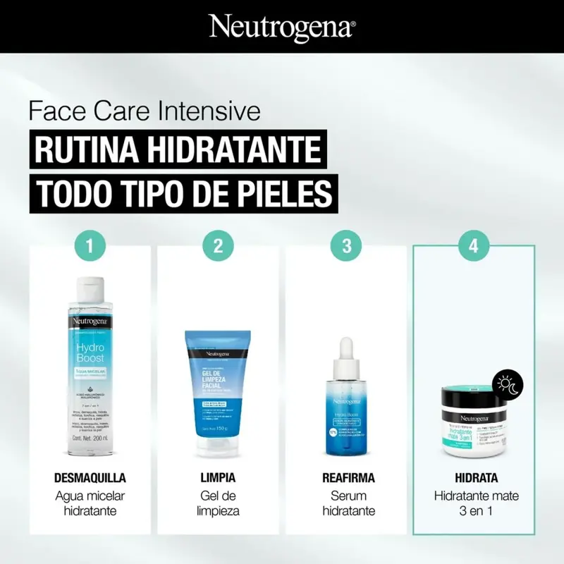 Crema hidratante en gel de Neutrogena Face Care intensive con fórmula avanzada brinda más ciencia a su piel con una combinación de D-pantenol, glicerina y arginina.Proporciona una hidratación intensa que reduce la grasa de la piel y controla el brillo durante 8 horas mientras previene los signos del envejecimiento.De textura ligera y de rápida absorción, dejando un tacto seco sobre la piel.Apto para uso de día y noche, idealmente día.