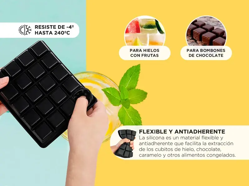 No solo es ideal para hacer cubitos de hielo, sino que también es versátil y puede usarse para hacer chocolates, caramelos o incluso cubitos de caldo congelado para tus recetas favoritas.