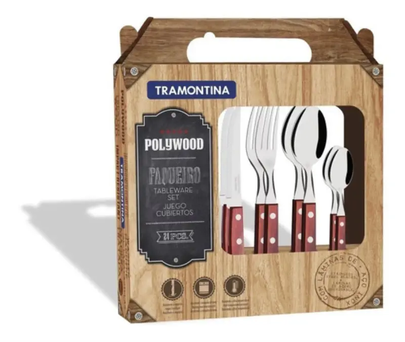 Cooking StoreSet x 24 Cubiertos Tramontina PolywoodAcero Inoxidable Mango Madera TratadaAcero Inoxidable excelente calidad Tramontina Brazil.Mango madera tratada color cerezo.El set Incluye:- 6 cuchillos español.- 6 tenedores de mesa.- 6 cucharas de mesa.- 6 cucharitas de té.