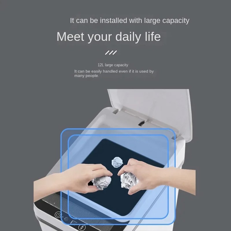 Cesto de basura con sensor de apertura automática y cierre por inducción. Disponible en colores blanco y gris, con una capacidad de 12 litros. Cuenta con carga USB para mayor comodidad, eliminando la necesidad de cambios frecuentes de baterías. Su diseño incluye un interruptor de pantalla táctil y apertura de tapa en 360 grados. Ideal para uso doméstico o en oficinas.