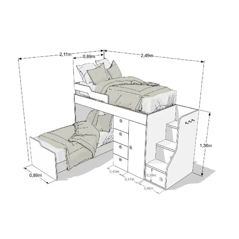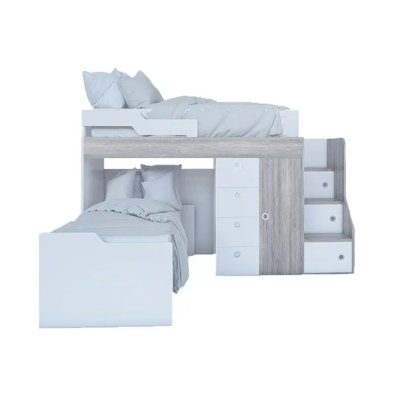 - Almacenamiento Integrado: Escalera con tres cajones y un cajón extra debajo de la cama inferior.