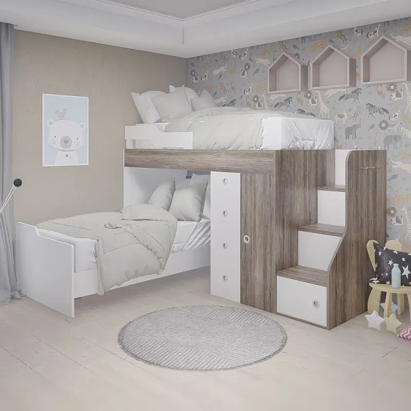 La Cucheta con 3 Cajones y Escalera de EMC Muebles es la solución ideal para habitaciones infantiles que necesitan optimizar el espacio. Su diseño integra una escalera con tres cajones de guardado en cada escalón, perfectos para organizar ropa, libros y juguetes. Además, cuenta con un cajón espacioso debajo de la cama inferior, ideal para sábanas y frazadas.