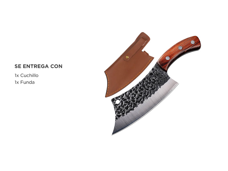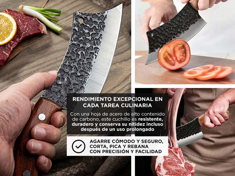 Nuestro cuchillo de chef forjado a mano ofrece un rendimiento excepcional en cada tarea culinaria. Con una hoja de acero de alto contenido de carbono, este cuchillo es resistente, duradero y conserva su nitidez incluso después de un uso prolongado.