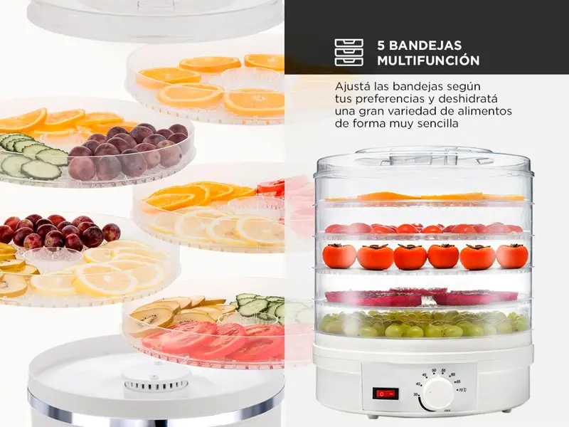 Con su diseño ajustable y fácil de usar, simplemente selecciona la temperatura deseada y deja que la deshidratadora haga el resto. Su proceso casero garantiza alimentos sin aditivos ni conservantes, conservando todos los nutrientes y vitaminas naturales. Además, su diseño desmontable facilita la limpieza y ajuste de las bandejas según tus necesidades.