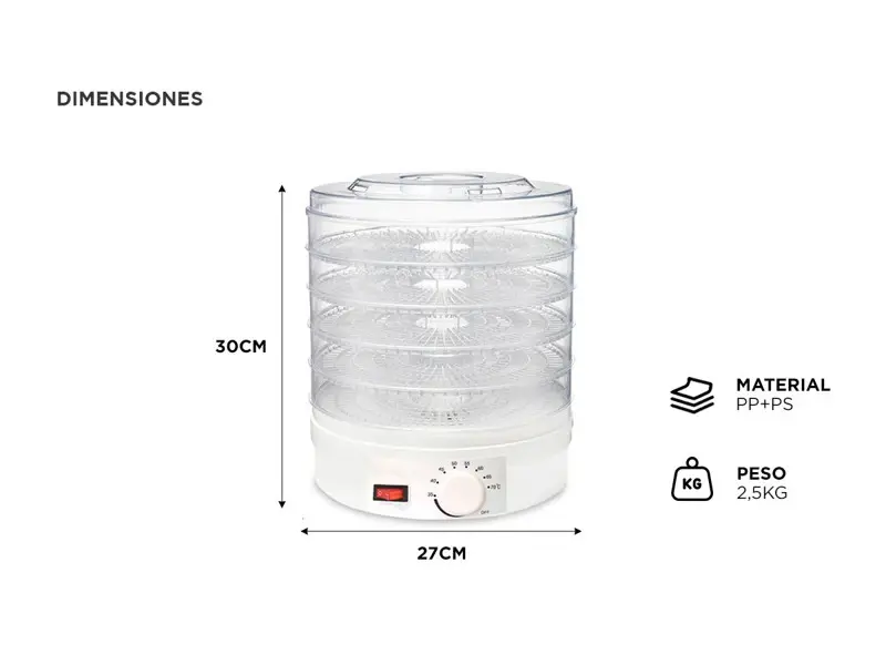 Nuestra deshidratadora multifuncional te ofrece una manera fácil y saludable de disfrutar de una amplia variedad de alimentos deshidratados en casa. Con capacidad para deshidratar frutas, verduras, carne, hierbas e incluso flores, esta máquina es perfecta para cualquier amante de la cocina.