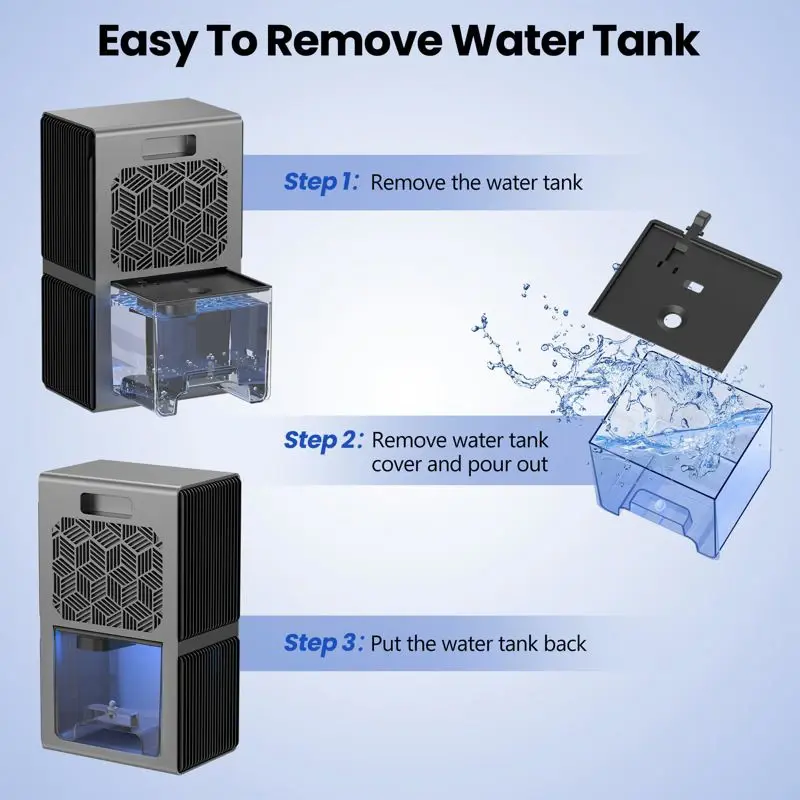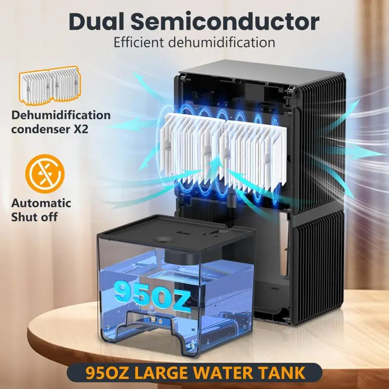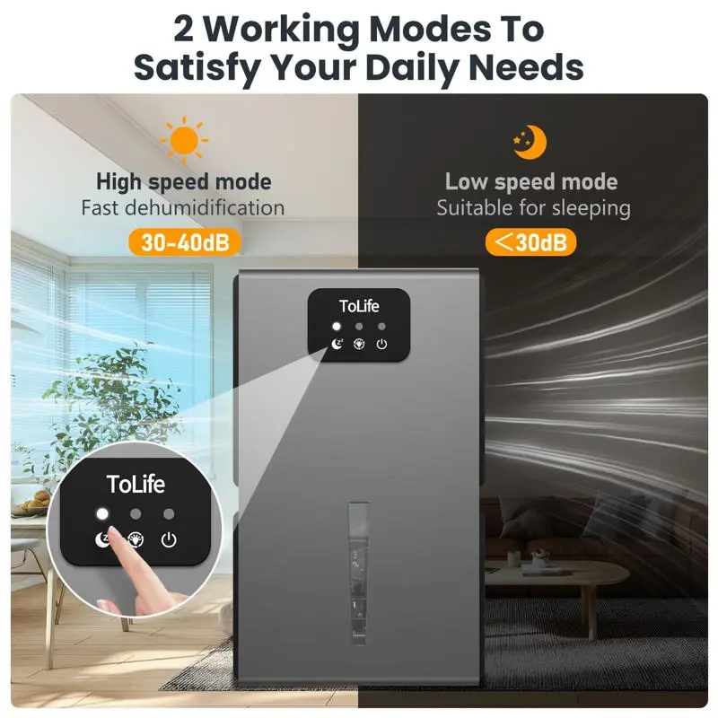 deshumidificador- Potente eliminación de la humedad: el deshumidificador ToLife utiliza una avanzada tecnología de condensación de semiconductores para eliminar la humedad del aire de forma silenciosa y eficaz. Es perfecto para dormitorios, baños, sótanos, cocinas, armarios y más- Apagado automático inteligente: nuestro deshumidificador para sótanos tiene una función de apagado automático inteligente que se activa cuando el tanque de agua está lleno o desalineado, lo que evita que se desborde y garantiza la seguridad y la comodidad, incluso cuando no estás en casa- Luces nocturnas ambientales: con 7 opciones de color LED, nuestro deshumidificador para dormitorio añade un toque romántico a tu espacio y puede servir como luz nocturna para un entorno de sueño reconfortante. Además, la empuñadura integrada permite un fácil transporte