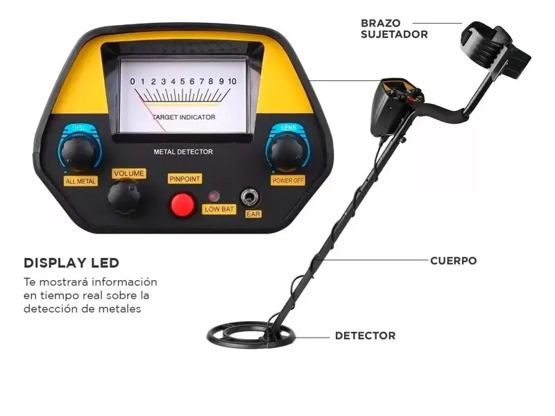 Acerca de Detector de Metales Gadnic Profesional Alta Sensibilidad Bienvenidos buscadores de tesoros y amantes de la exploración Si estás buscando un detector de metales que te ofrezca una experiencia de búsqueda avanzada y cómoda, estás en el lugar correcto. Presentamos nuestro detector de metales inalámbrico con 3 modos, display LED e inalámbrico. Este detector es una herramienta imprescindible para todos aquellos que buscan metales enterrados en la playa, el campo o cualquier otro lugar que quieras explorar. Con tres modos de detección para adaptarse a diferentes tipos de suelo y objetivos, el display LED te mostrará información en tiempo real sobre la detección de metales. Además, con su tecnología inalámbrica podrás disfrutar de la libertad de movimiento que necesitas para realizar una búsqueda efectiva y cómoda. Olvídate de los detectores de metales con cables y hazte con nuestro detector de metales inalámbrico con 3 modos, display LED e inalámbrico. ¡Disfruta de la emoción de la búsqueda de tesoros sin límites! Especificaciones Material: ABS+aluminio+cobre Modo de detección: todo metal Detectar objetos: metal, monedas, reliquias, joyas, oro, plata Sensibilidad:> 20 cm Frecuencia: aproximadamente 6,6 kHz Dos tonos para indicar diferentes tipos de metal Fuente de alimentación: batería 2 * 9V 6F22 (NO incluida) Diámetro de la bobina: 245 mm / 9,65 pulg.