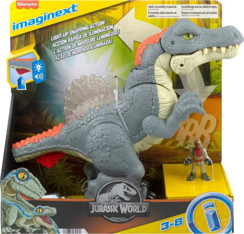 La franquicia Jurassic World cobra vida en las manos de tu hijo con este dinosaurio Imaginext Jurassic World Ultra Snap Spinosaurus de Fisher-Price. Este gran dinosaurio esta listo para abrirse paso mientras tu hijo juega. Cuando aprieta el gatillo de la cola, su cabeza se inclina hacia atras y su boca se abre y se agacha para atacar. El gatillo tambien activa las luces multicolores de las aletas, mientras que sus ojos se iluminan y salen sonidos de dinosaurios. Los niños pueden usar la figura de juguete incluida para crear sus propias historias de dinosaurios hasta donde les lleve su imaginacion