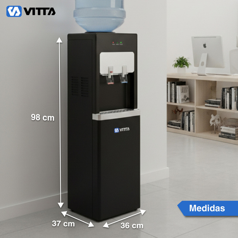 El Dispenser de Agua Vitta DAFCB002 ofrece agua fría y caliente al instante, con un diseño moderno, práctico y funcional, ideal para hogares, oficinas o espacios de trabajo. Su conservadora inferior brinda un espacio adicional para almacenar botellas, vasos o snacks, optimizando el uso diario.