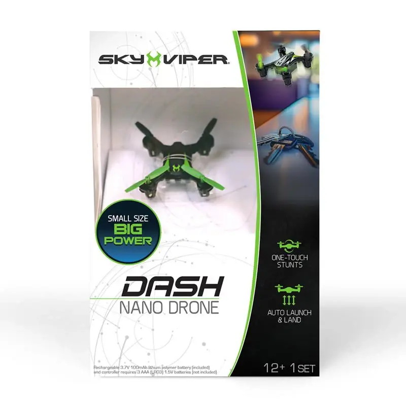 Nanodron Sky Viper Dash- El desplazamiento automatico mejorado permite un control mas facil entre comandos- Ocho acrobacias con un solo toque son visualmente impresionantes- Lanzamiento y aterrizaje automaticos para un vuelo estacionario con un solo boton y un aterrizaje suave- El modo de vuelo dual permite elegir entre modo automatico y manual- El embalaje puede variar