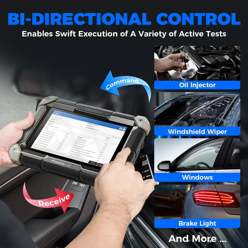 - Diagnóstico completo de sistemas y pruebas activas en motor, transmisión, ABS, airbag y otros sistemas del vehículo.